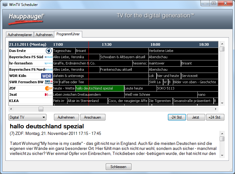 Die von digitalen TV-Sendern (DVB-C, DVB-S, DVB-T) ausgestrahlten Programm-Informationen werden von WinTV v7 ausgewertet und angezeigt. Hierüber ist auch eine bequeme Programmierung von Aufnahmen möglich.