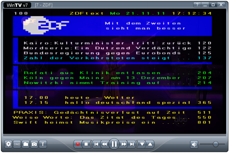 Videotext-Informationen von analogen und digitalen TV-Sendern werden per Mausklick angezeigt. Der Videotext wird genau wie bei einem Fernsehgerät über das TV-Bild gelegt.
